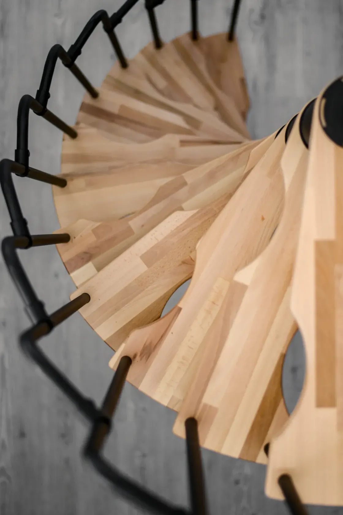 Deze Ruimtebesparende Spiltrap Is Een Spiraalvormig Model Met Treden Van Gelakt Beuken En Een Zwart Metalen Leuning.