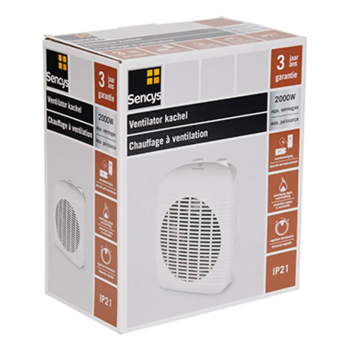 Met De Ventilatorkachel Van Sencys Kun Je Verschillende Binnenruimtes Snel Opwarmen. De Verwarming Is Voorzien Van Twee Vermogensstanden: 1000 En 2000 Watt. Naast Het Blazen Van Warme Lucht Is Het Ook Mogelijk Om De Ventilator In Een Koude Lucht Ventilatiestand Te Gebruiken. De Elektrische Verwarming Is Niet Alleen Beveiligd Tegen Oververhitting, Maar Beschikt Ook Over Een Omvalbeveiliging. Zo Schakelt Hij Uit Automatisch Uit Zodra De Verwarming Een Te Hoge Temperatuur Bereikt Of Wanneer Hij Omvalt. Bovendien Is De Kachel Spatwaterdicht Dankzij Het Ip21 Certificaat.
