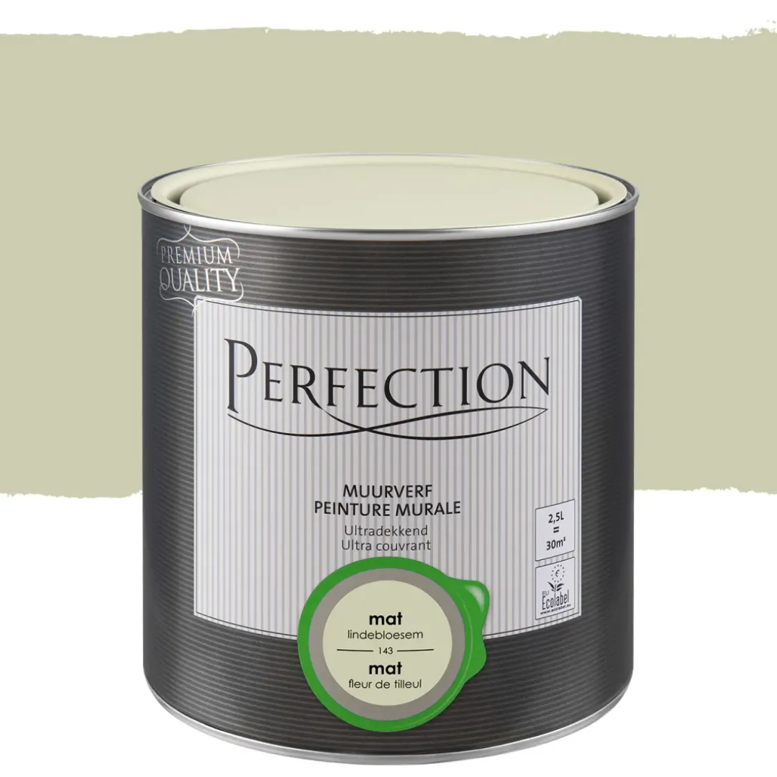 Deze Ultradekkende Matte Muurverf In De Tint Lindebloesem Van Perfection Is Een Groene Verf Op Waterbasis. Een Pot Van 2,5 Liter Is Goed Voor 30 M².