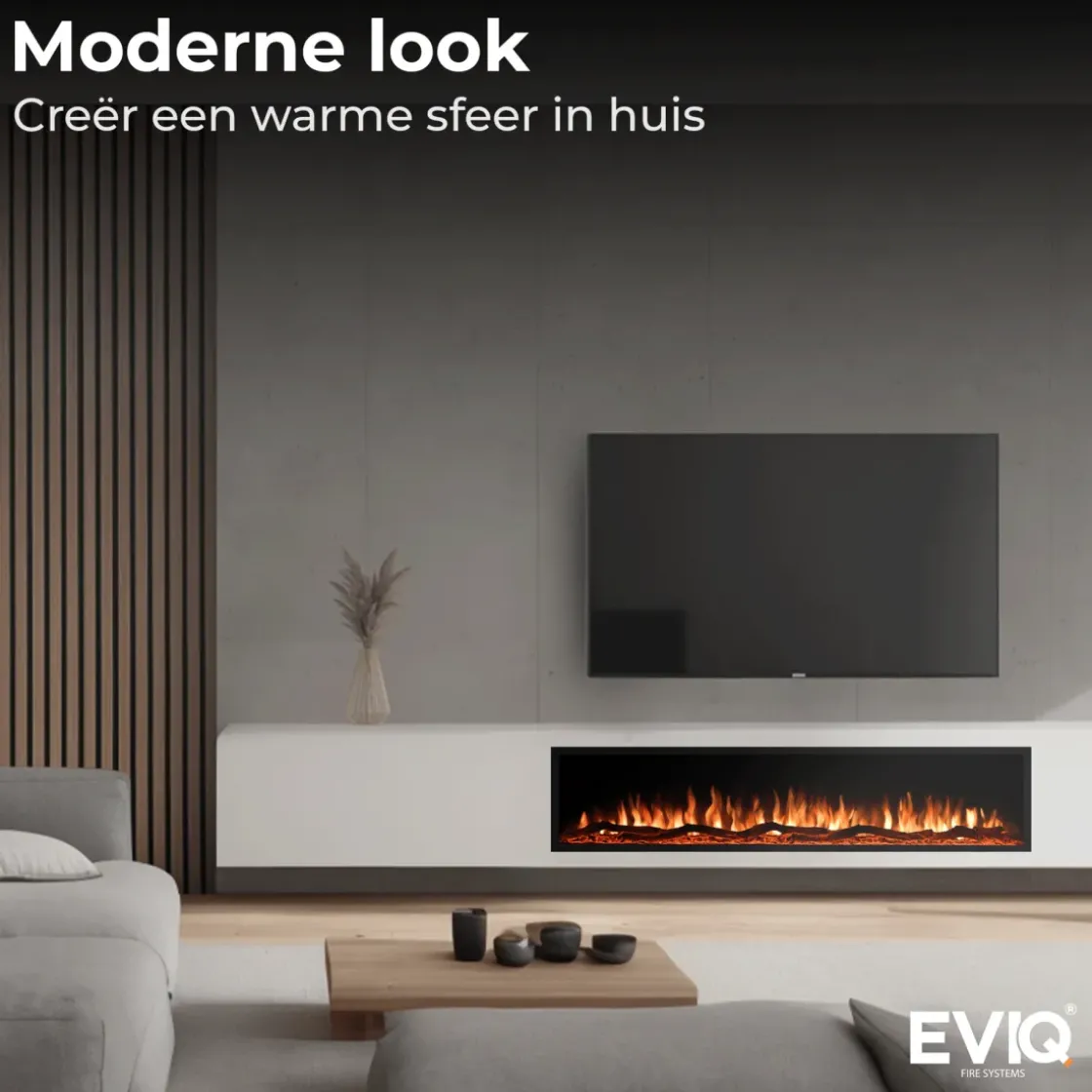 De Elektrische Sfeerhaard. Een Prachtige Elektrische Sfeerhaard Die Vormgegeven Wordt Door Een Dunne Frame Met Levensechte Vlammenbeeld. De Reden Dat Er Zoveel Mensen Kiezen Voor De Eviq Smartline Is Natuurlijk Het Feit Dat Je Deze Elektrische Haard Op Nagenoeg Ieder Mogelijk Plek Neer Kunt Hangen. Bij Een Elektrische Haard Is Het Niet Meer Nodig Om Met Afvoerbuizen Aan De Haal Te Gaan, Hierdoor Kun Je Jouw Ambiance Gewoon Aan De Muur Hangen. De Innovatie In Deze Haard Is Goed Terug Te Zien In Het Feit Dat Je Gebruik Kunt Maken Van De Multi-Color Smart Led Technology (Slt 2.0) En Multi Color Flames (Mcf). Stel De Vlammen In Op De Kleur Die Jij Het Mooist Vindt Voor In Huis. Dankzij De Ruime Hoeveelheid Keuzemogelijkheden Heb Je Hier Zelf De Controle Over. Bij Aankoop Krijg Je Standaard Crystal Ice, Luxe Houtstammen Set En Afstandsbediening.