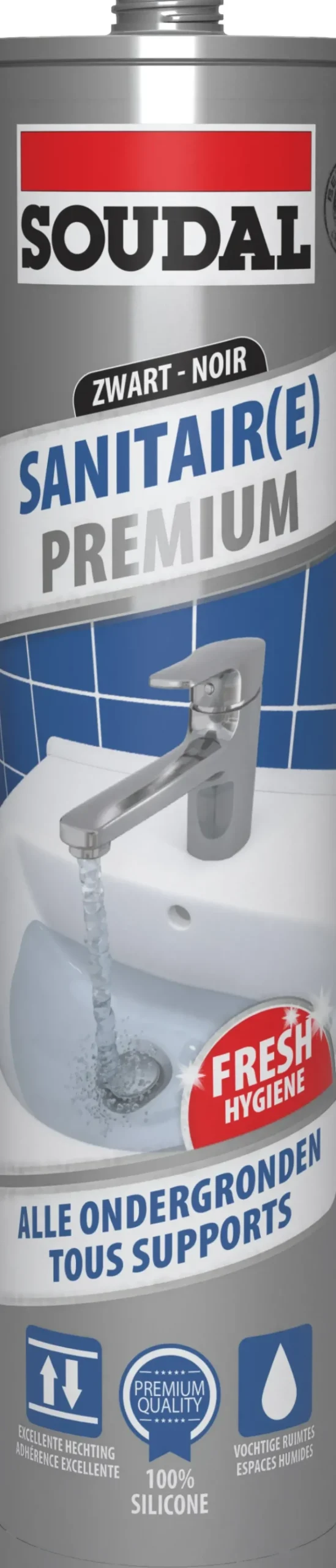 Soudal Silicone Sanitaire Premium Zwart 290Ml Is Een Neutrale En Blijvend Elastische Siliconen Voor Het Afdichten Van Voegen In Sanitaire Of Natte Omgevingen.